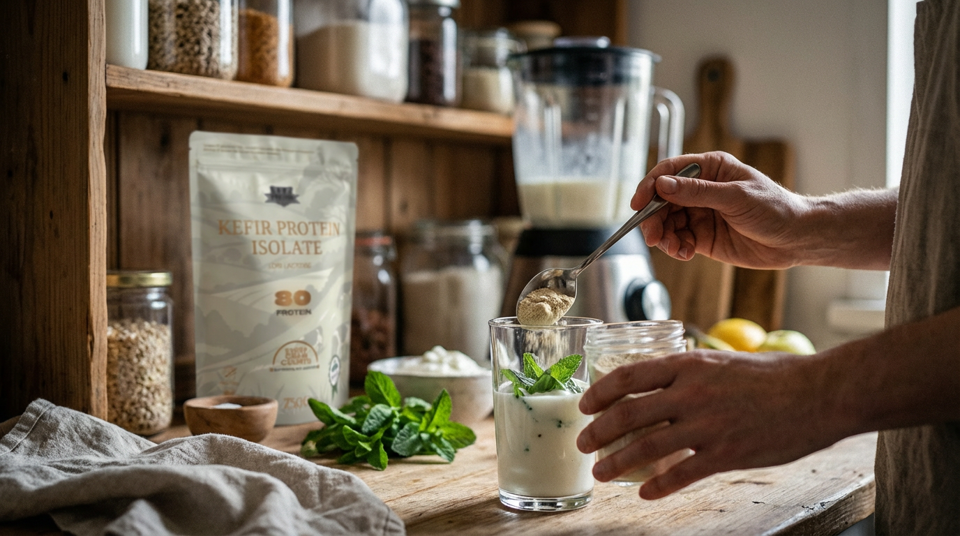 Das Kefir Protein Isolat lässt sich gut in Wasser oder Milch in einem Protein Shakerbecher oder Mixer auflösen.
