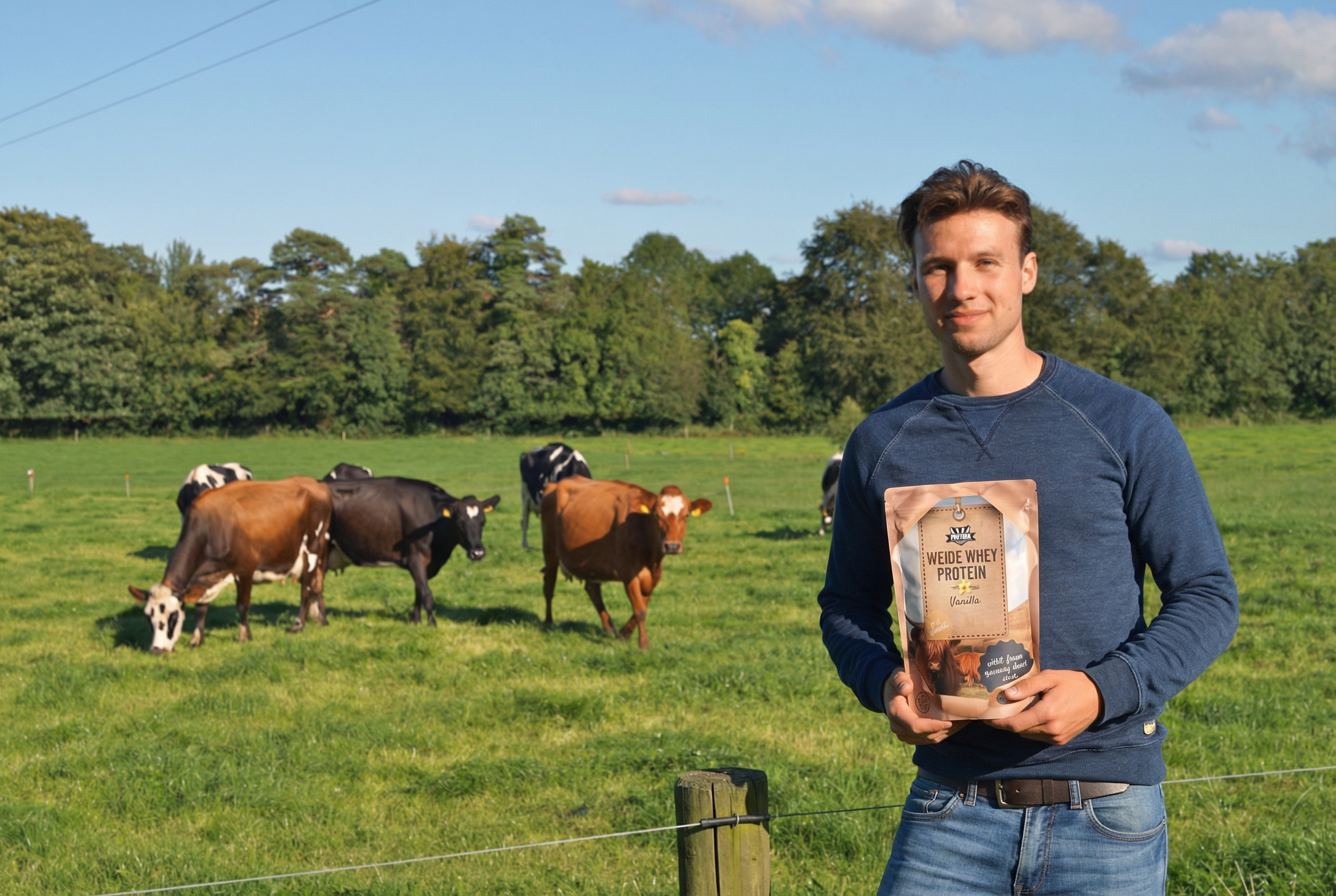 Im Bild: Gründer Michael in Irland mit unserer allerersten Verpackung - Das erste echte Grass-fed Whey in Deutschland